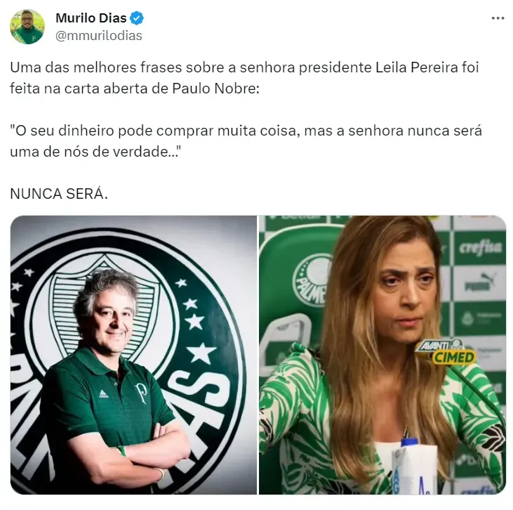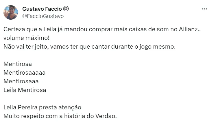 Assim como Trajano, a torcida do Palmeiras não gostou do que foi dito por Leila na coletiva. Criticada por “se achar dona do Clube” e por apresentar “conflito de interesses”, por ser presidente e patrocinadora da equipe, a mandatária não vive o seu melhor momento na relação com os torcedores. Primeira mulher a assumir o cargo na história, o ciclo de Leila Pereira na presidência do Palmeiras vai até o final de 2024.