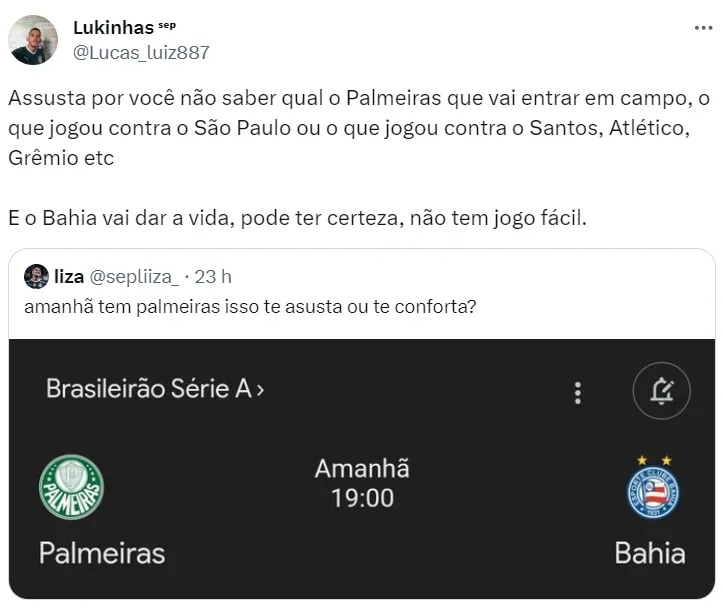 “Não tem mais jogo fácil, já que tanto as equipes de baixo querem sair da parte incômoda quanto as de cima querem se firmar no G-4 e na briga pelo título. Agora cada jogo é uma final e temos que encarar assim, respeitando muito o Bahia, mas, com certeza, diante da nossa torcida, fazer um grande jogo e somar mais três pontos”, concluiu o jogador do Palmeiras.