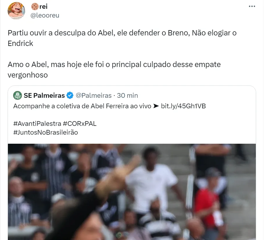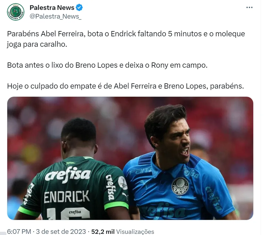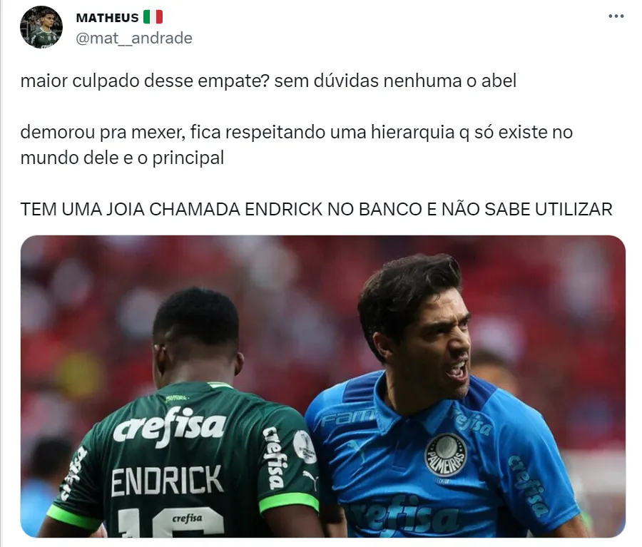 “Endrick NÃO PODE ser reserva do Rony. Com dez minutos em campo produziu MUITO MAIS do que o camisa 10. Chega. O Abel precisa dar uma explicação pra torcida”, disse o perfil Porco Stats no Twitter. Outros palmeirenses afirmaram que o empate contra o Corinthians está na conta de Abel (como pode ser visto em comentários acima) e, além disso, cobram justificativas do treinador por manter Rony de titular ao invés de Endrick.
