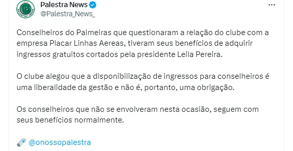No entanto, uma situação antes da partida acabou deixando o clima nos bastidores pra lá de pesado. De acordo com o Nosso Palestra, no último dia 28 de agosto alguns conselheiros do Verdão pediram esclarecimentos à presidente Leila Pereira a respeito da relação do Clube Paulista com a Placar Linhas Aéreas em documento destinado ao Conselho de Orientação e Fiscalização (COF).