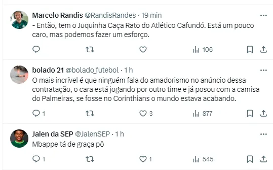 Enquanto isso, muitos torcedores ainda estão lamentando o empate no Derby Paulista, contra o Corinthians. O Palmeiras chegou a abrir 2 a 0, jogando muito melhor que o rival. Porém, viu seu adversário empatar em um dos últimos lances do jogo, após falha de Weverton.