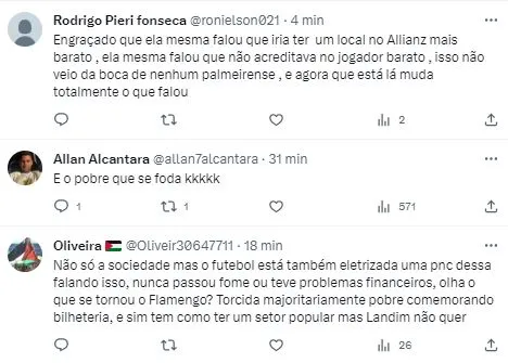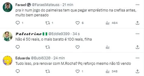 “Sobre o preço de ingressos. Só 10% das pessoas que assistem o jogo no Allianz Parque pagam o preço cheio. 90% tem algum tipo de desconto. Vou dar um exemplo. ‘Avanti Ouro‘ está em torno dos R$ 145. Se o Palmeiras jogar três vezes no mês, isso dá uns 40, 45 reais. Vamos lá, 50 reais. É popular ou não é? É leviano falar que os preços são exorbitantes. É leviano. 90% das pessoas que entram no Allianz têm algum tipo de desconto. Claro que é popular”, explicou.