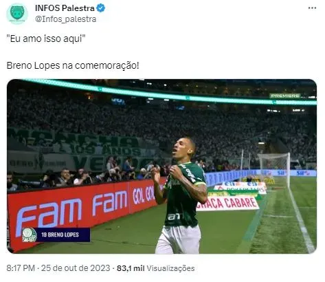 Breno Lopes concedeu entrevista após brilhar na goleada e desabafou sobre a felicidade de ser um dos principais protagonistas do duelo histórico e expôs o que motiva sua reviravolta no Verdão. “Feliz, né, pelas oportunidades que venho recebendo. Como eu falei, o grupo sempre acreditou em mim. O professor (Abel Ferreira) também. Então, quando a oportunidade aparece, eu sempre procuro dar o meu melhor para aproveitar”, declarou o camisa 19 das Alamedas.
