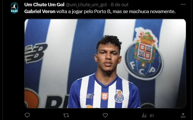Gabriel Veron tem apenas um jogo disputado pelo Porto na temporada 2023/24. O atacante é revelado nas categorias de base do Palmeiras, onde ganhou projeção para o mundo da bola em janeiro de 2020 após se destacar nos Subs-17 e 20. O camisa 7 saiu do Verdão para brilhar em Portugal, porém está longe de vingar em solo europeu.