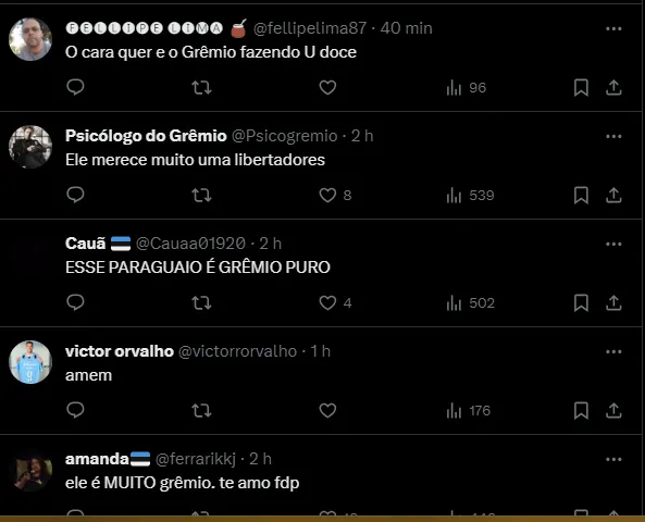 “Até agora, creio que meu futuro está no Grêmio. Quero jogar a Libertadores pelo Grêmio, que é um grande clube, que briga por todos os torneios que joga. Esperamos chegar o mais longe possível na Copa”, disse Villasanti.