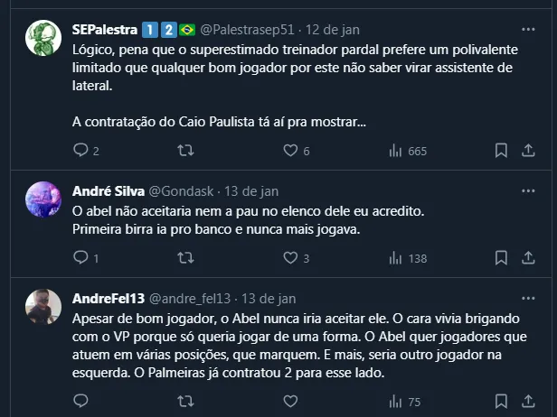Por fim, por mais que o Palmeiras não tenha nenhuma negociação em aberto com o jogador, o tema bombou entre os palmeirenses nas redes sociais. O jogador é avaliado em R$ 47 milhões pelo ‘Transfermarkt’ e o assunto gerou polêmica e atiçou os palestrinos.