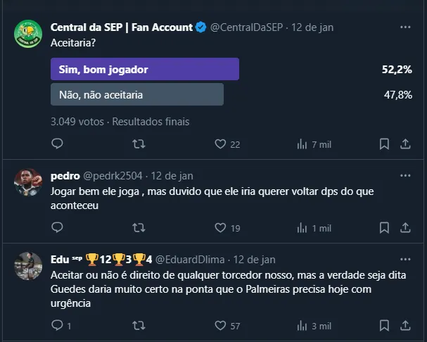 Assim, em uma postagem do perfil ‘Central da SEP’, a volta do atacante foi sugerida e os torcedores palmeirenses resolveram se manifestar de maneira surpreendente. Afinal, o atleta criou laços com o principal rival.