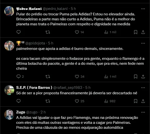 Uma que pode voltar é a Adidas, que deixou o Palmeiras em 2018, mas deseja retomar a grande parceria, que durou pouco mais de dez anos. O Verdão tem contrato com a Puma até o final da temporada.