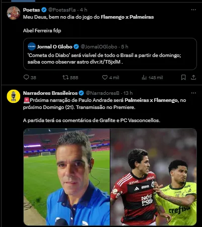 Ele começou já deixando claro acredita na vitória do time de Abel Ferreira. “Palmeiras x Flamengo: Palmeiras (ganha). Os corinthianos ficam bravos comigo”, cravou.