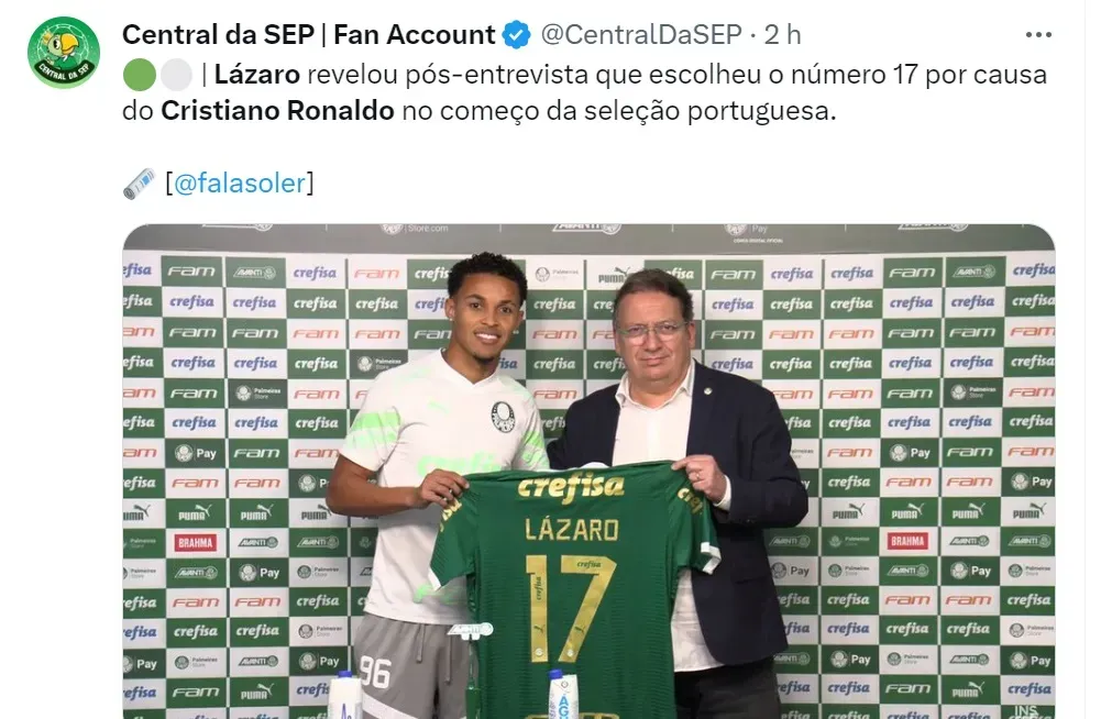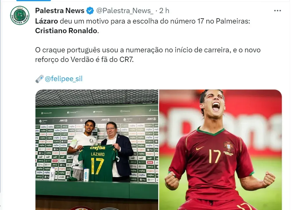 Isso porque o Palmeiras já está garantido no Super Mundial de Clubes da FIFA, que será realizado no ano que vem nos EUA. Até lá, Lázaro vai usar a camisa 17, uma homenagem a CR7 no seu início de trajetória na Seleção de Portugal.
