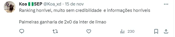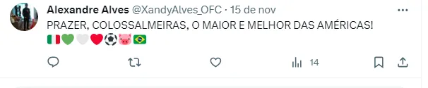 Com isso, o Verdão tem 212 pontos. Na frente estão apenas a Inter de Milão, da Itália, com 241, o Al-Ahly, do Egito, com 244, o Real Madrid, da Espanha, com 288, e o líder Manchester City, da Inglaterra, com 298.