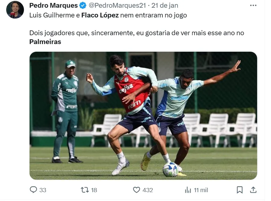 A reclamação vem pela escolha do camisa 10 como titular diante do Novorizontino em vez do jovem Luis Guilherme, que se destacou na pré-temporada, ou Flaco López, única opção de referência na área alviverde.