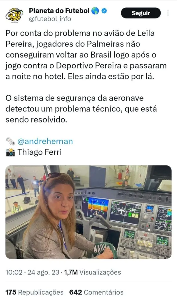 Com o Palmeiras se restabelecendo na temporada, Leila Pereira parecia que finalmente iria ter um período de sossego após a polêmica envolvendo a compra de um avião e a ausência de reforços para o restante da temporada. Mas a falha técnica do avião que atrasou o retorno da delegação ao Brasil após o triunfo Deportivo Pereira por 4 a 0, na quarta-feira, pela rodada de ida das quartas de final da Libertadores, na cidade colombiana de Pereira. Toda a logística da equipe precisou ser mudada após o problema na aeronave.