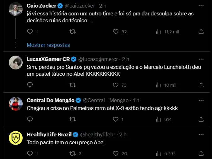 A repercussão nas redes sociais dá conta que a SEP está a procura de saber de onde vem os vazamentos: “De acordo com o UOL, o Palmeiras está caçando um possível X-9 apontado por Abel Ferreira em uma coletiva desde abril. O X-9 procurado pelo treinador é responsável por vazar as escalações. Abel entende que o mais grave é a quebra de confiança interna”, destaca o perfil da R10 Score.