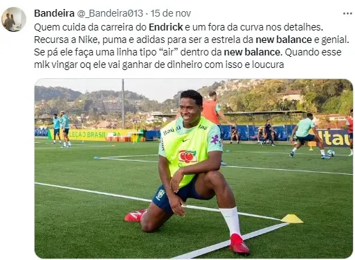 Diferente dos demais jogadores que fecham com Nike, Puma e Adidas, Endrick resolveu fechar com a New Balance para ser seu patrocinador esportivo. Ele aceitou menos dinheiro, mas a empresa foi a única que atendeu a exigência da família com um contrato menor de apenas 4 anos.