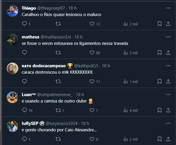 Em vídeo publicado nesta quinta-feira (28) pelo portal esportivo Nuestros Deportes, da Colômbia, Ríos foi filmado jogando uma “pelada” no país de origem. Se por um lado ele apareceu fazendo jogadas de efeito e humilhando alguns adversários, o fato de estar vestindo a camisa do Tottenham-ING irritou alguns palmeirenses.