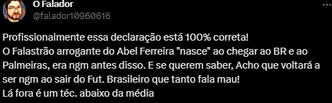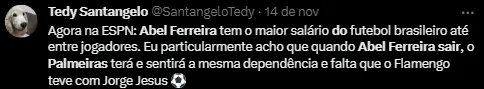 Tanta revolta com o nosso futebol e o desejo de cair fora, faz questionar se o treinador português teria tanto prestígio, ou um salário rechonchudo, em outro lugar, como tem aqui. Dos 7 títulos que Abel tem como treinador, 6 foram graças ao futebol brasileiro. Dos 10 prêmios individuais que ganhou como técnico, 10 são prêmios brasileiros. Todo seu reconhecimento e carreira como treinador, está aqui, no Brasil.
