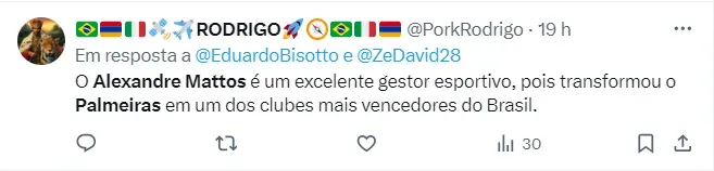 A notícia impactou nos bastidores da torcida palmeirense, que lembra com carinho da passagem de Mattos no alviverde entre 2015 e 2019, quando o clube levantou dois campeonatos brasileiros (2016 e 2018), e uma Copa do Brasil (2015).