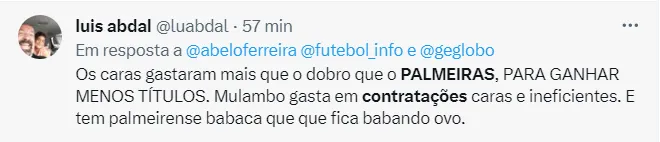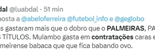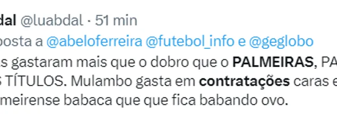 Para que não veja títulos indo para o ralo em 2024, o Palmeiras deve ser mais ativo no mercado, tentar contratações de impacto e se arriscar. Pois Abel, que fez muito com o pouco que lhe foi oferecido em 2023, será bem mais exigente com contratações na próxima temporada.