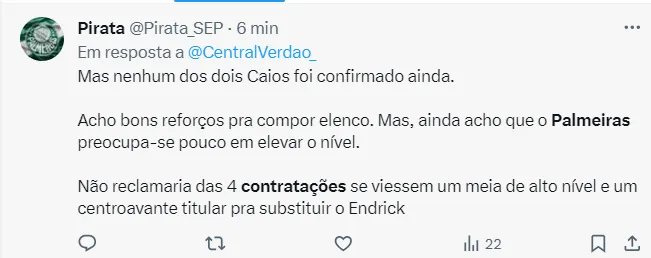 O que deve deixar a torcida palmeirense ainda mais receosa é que de todos os nomes que estão sendo especulados no Verdão, nenhum nome de peso surge com tanta força, o que deixa a sensação que o Palmeiras está trazendo mais do mesmo.