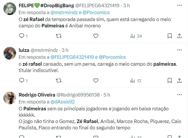 Quem atua na mesma faixa de campo que estes jogadores e já é um jogador provado e multicampeão no Palmeiras é o volante Zé Rafael. Ele não tem atuado nas últimas partidas por conta de uma virose, e agora está com uma lombalgia.