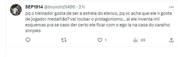 Outro internauta acabou indo na mesma linha: “Mas falar que o Teimoso Ferreira está errado é crime nesta rede. Continuem apoiando a aberração que é ter um lateral de ponta do que um atacante bom que faz gols e joga mais que o cone Rústico. Ah, verdade, não pode falar mal dele porque ele é o queridinho do Teimoso Ferreira!”, reclamou. Outro torcedor também reclamou de Abel: “As ruas jamais esquecerão o que o Sr. Abel Ferreira está fazendo”, brincou.
