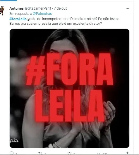 Nas redes sociais, a hashtag #ForaLeila está entre os assuntos mais comentados no twitter. A torcida demonstra total insatisfação com a gestão da diretora, que no início do mandato fez algumas promessas, mas não as cumpriu. Dessa forma, com as eliminações e a falta de reforços a torcida palmeirense está enfurecida com a diretora e também patrocinadora do Palmeiras.