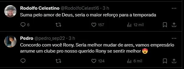 Então, após essa publicação do jornalista, torcedores do Palmeiras comentaram sobre o assunto, sobre o momento de Rony com a camisa do Verdão. A maioria não gostou do que leu sobre o camisa 10:
