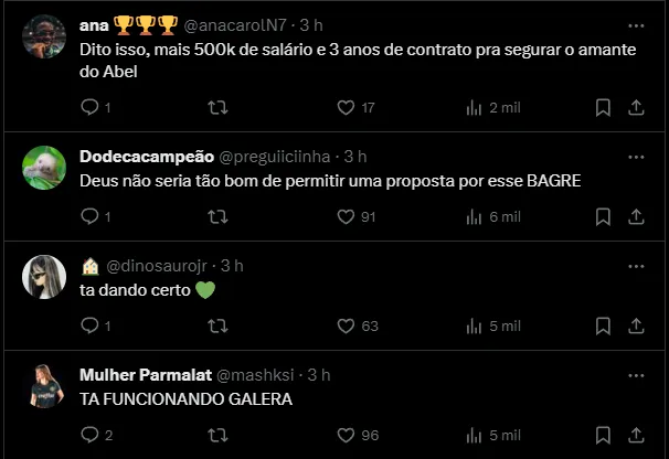 Em contrapartida, em um tom mais humorístico, um torcedor opinou sobre o assunto: “Dito isso, mais 500k de salário e três anos de contrato para segurar o ‘amante’ do Abel“.