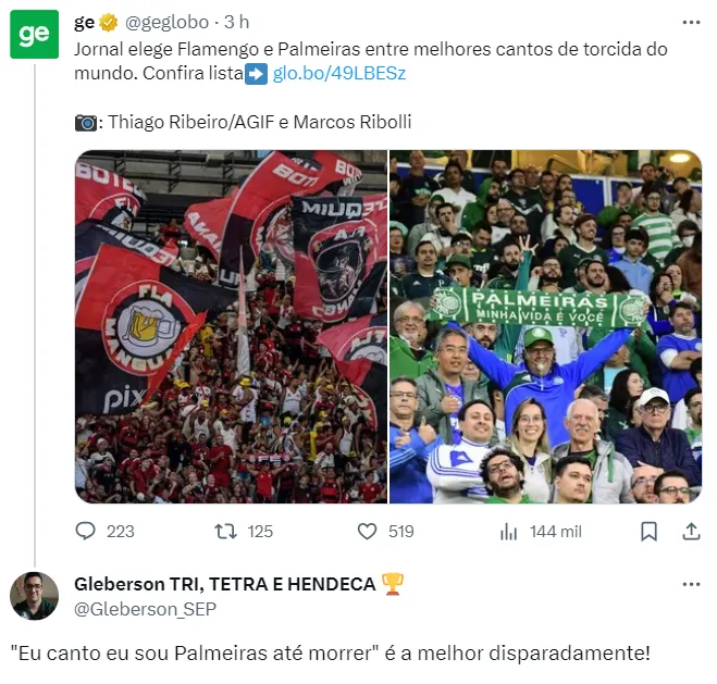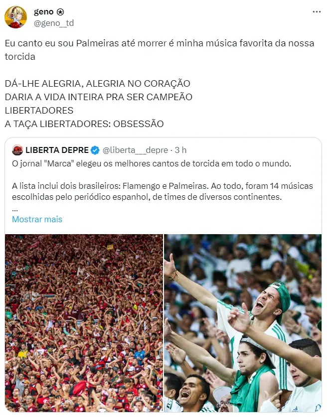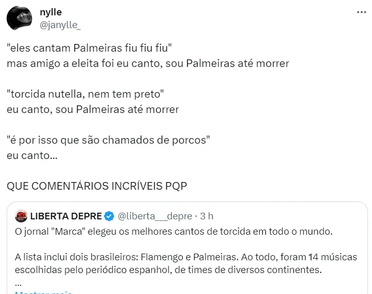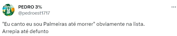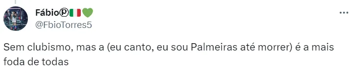No X, antigo Twitter, torcedores afirmam que a canção do Palmeiras “é a melhor disparadamente”, e “é boa demais mesmo…”, chegando a brincar que ela “arrepia até defunto”.