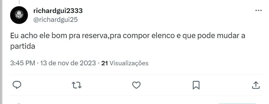 Além disso, Gabriel Menino sofreu fratura no tornozelo e só deve voltar aos gramados em 2024. Atualmente, a dupla titular de volantes do Alviverde é formada por Zé Rafael e Ríchard Rios.