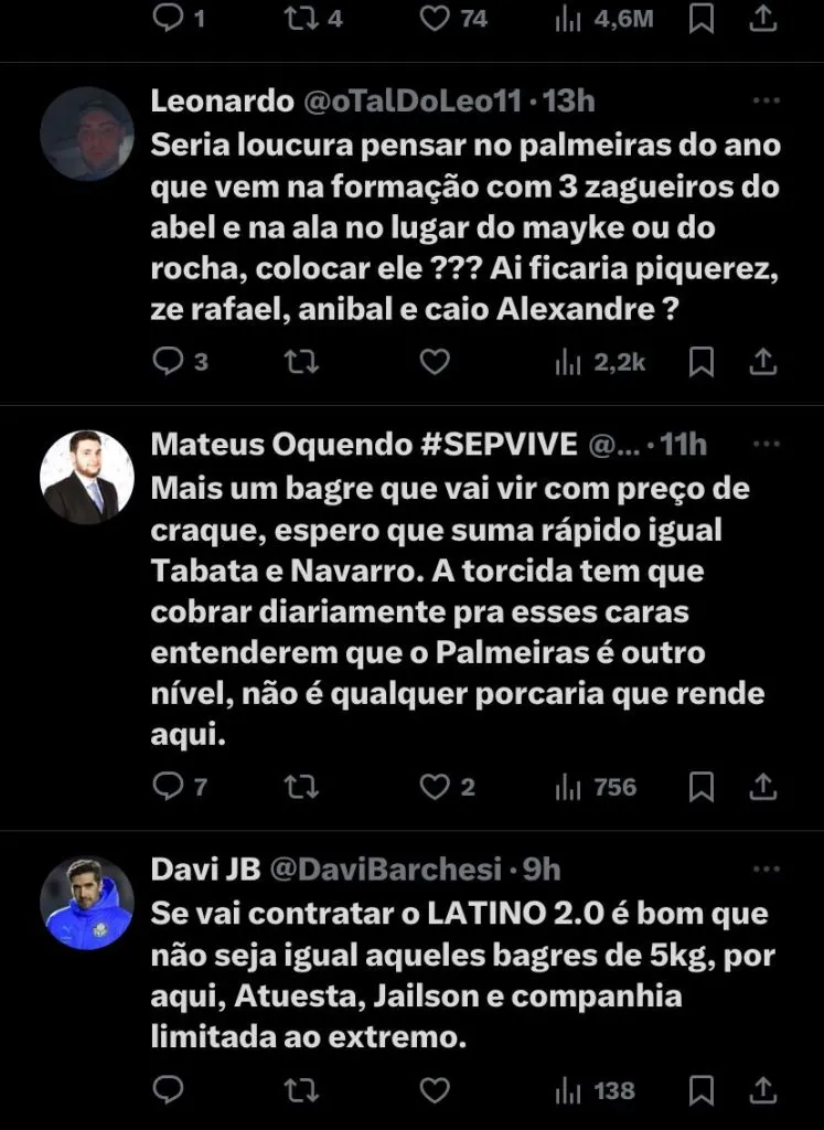 (SIC) “Se vai contratar o LATINO 2.0 é bom que não seja igual aqueles bagres de 5kg, por aqui, Atuesta, Jailson e companhia limitada ao extremo”; “Seria loucura pensar no Palmeiras do ano que vem na formação com 3 zagueiros do abel e na ala no lugar do mayke ou do rocha, colocar ele? Ai ficaria piquerez, Zé Rafael, Aníbal e Caio Alexandre?”, foram alguns comentários.
