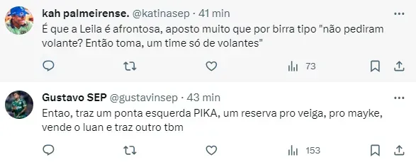 Outro fez questão de criticar a presidente Leila Pereira. Segundo ele, a dirigente está fazendo isso para afrontar a torcida: “É que a Leila é afrontosa. Aposto muito que por birra, tipo ‘não pediram volante? Então toma, um time só de volantes’”, disse.