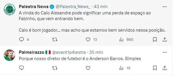 “Por que o Palmeiras vai contratar o Caio Alexandre? Mesmo se o Menino sair, não vejo como necessário gastar tanto nessa posição: Aníbal + Zé titulares, Richard + Fabinho reserva. Pedro Lima volta de empréstimo depois”, afirmou um torcedor.