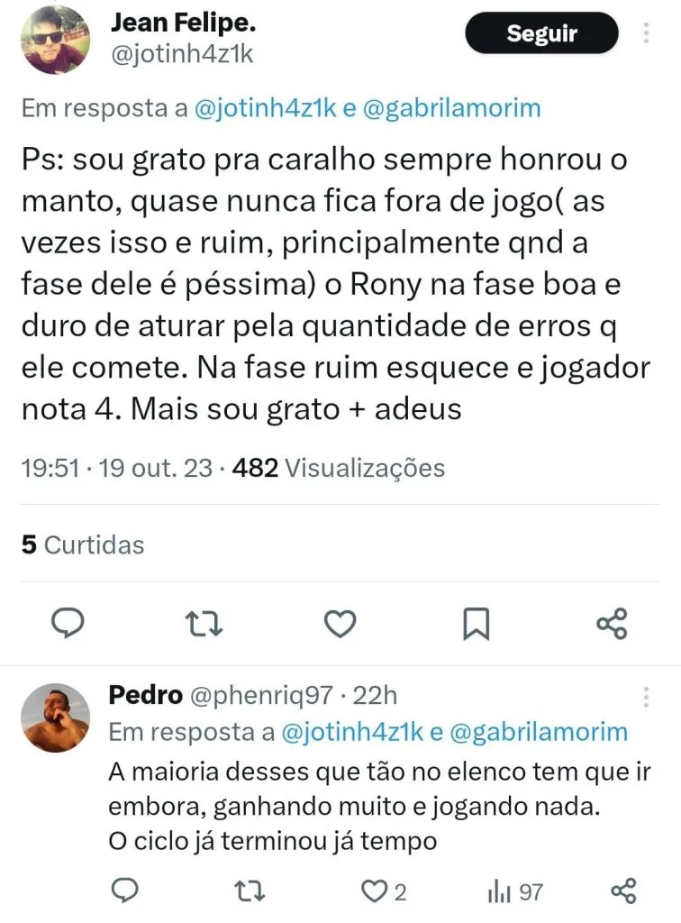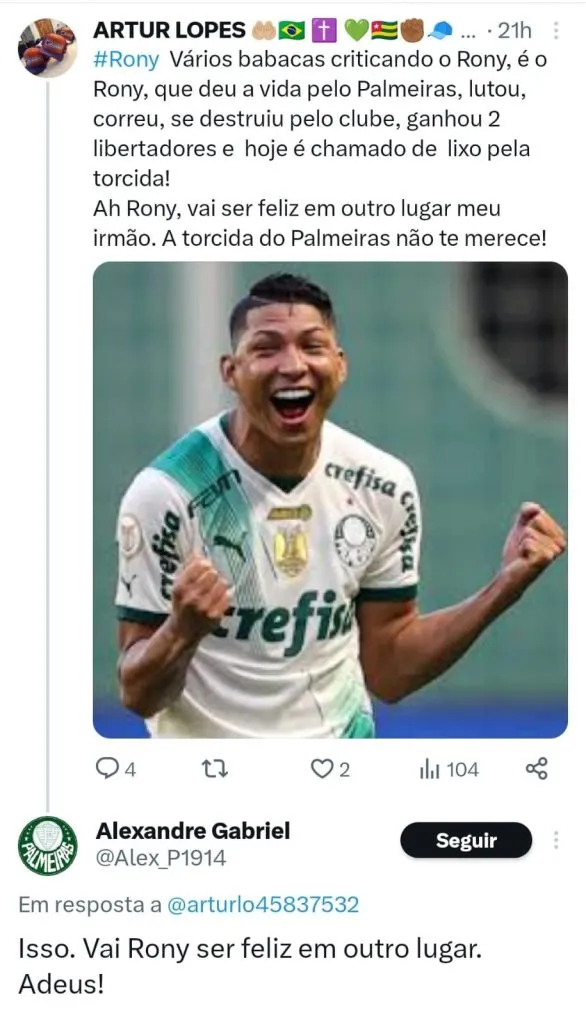 “Rony voltou a ser o de 2020, e desse jeito, não serve. Ninguém é intocável, ninguém é maior que o clube. Mas a ingratidão não é um dos meus maiores defeitos. Jamais o desrespeitarei. Jamais o xingarei. É nas dificuldades que mostramos do que somos feitos.”, publicou um torcedor que foi rebatido: “Gratidão por alguém que fez o que ganha (e ganha MUITO) pra fazer? Entrar com garra é o mínimo. Ele conquistou muita coisa aqui, mas o ciclo parece que acabou.”, respondeu outro.