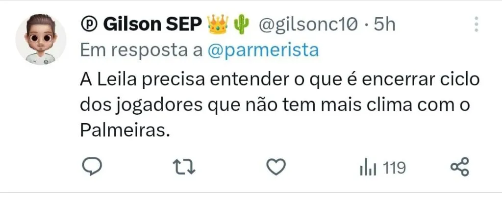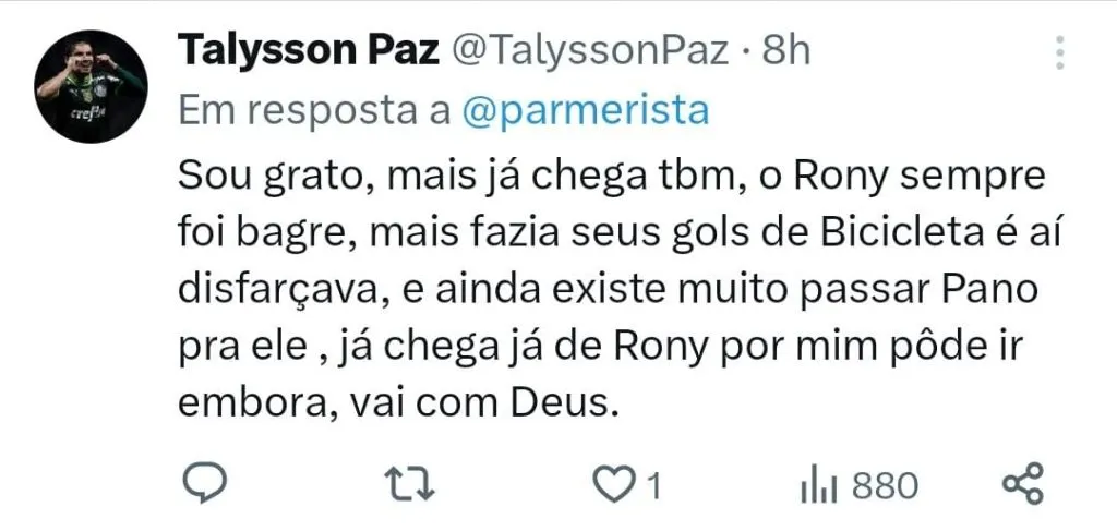 Apesar de a opinião sobre o momento ruim de Rony e a chegada do fim do seu ciclo com o Palmeiras ser quase uma unanimidade, quando o assunto é o reconhecimento sobre os feitos do atacante, a torcida se divide. “Nos entregou vários nadas. Inclusive se o Veron não entra no lugar dele na semifinal contra o Galo em 2021 e na final do Paulista contra o SP em 2022 era 2 títulos a menos pra nós (3 com a Recopa que jogamos por ter ganho a libertadores). Me desanima esse bagre ser nosso 10”, detonou um internauta.