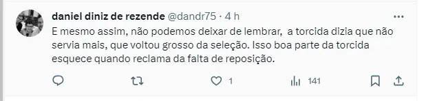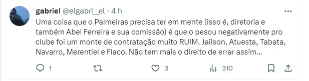 Outro revelou que o tempo mostrou o quanto Danilo era importante para o Verdão: “Hoje estou convicto que o Danilo era uma peça de dificílima reposição! Ele é o famoso box to box. Time perdeu muito sem ele”, completou.