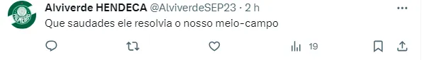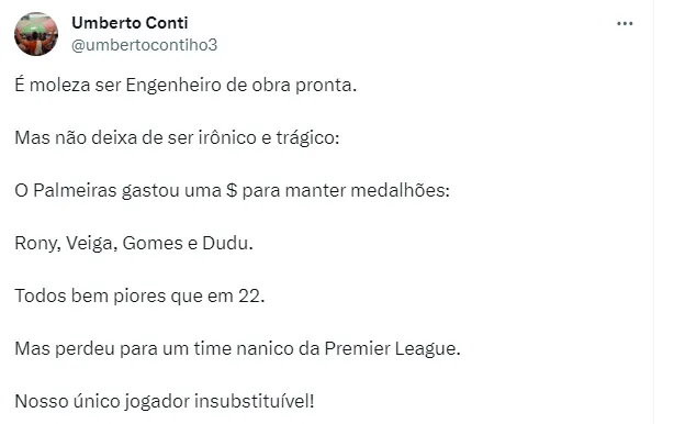O volante foi vendido para o Nottingham Forest, da Inglaterra, e foi relembrado no Twitter: ”Palmeiras gastou uma $ para manter medalhões: Rony, Veiga, Gomes e Dudu. (…) Mas perdeu para um time nanico da Premier League nosso único jogador insubstituível!”, disse um torcedor.
