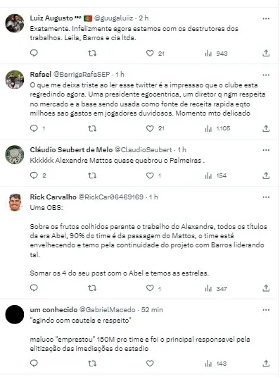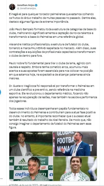 Alexandre, reestruturou o setor de futebol, enquanto o Dr. Magliocca transformou o Verdão em um clube científico, se tornando referência, além de João Paulo que profissionalizou o setor de categorias de base. Diante da postagem muitos torcedores concordaram com a opinião do torcedor, que entende que o Paulo Nobre foi o responsável pela nova era.