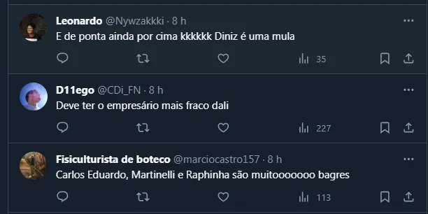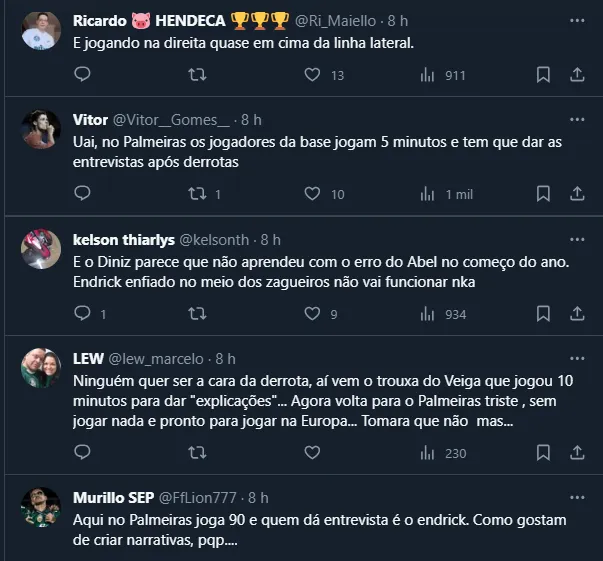 Aliás, os torcedores do Palmeiras ficaram “pistolas” com Diniz nas redes sociais. Afinal, além de colocá-lo por pouco tempo em campo, o comandante escalou Veiga aberto pela direita, o que gerou diversas críticas.