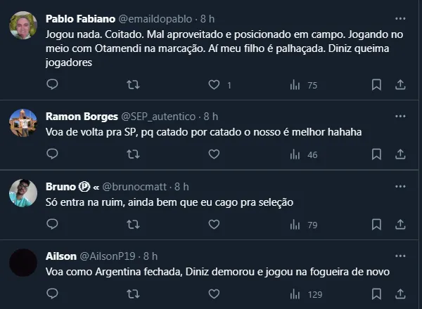 Dito isso, logo após Gabriel Martinelli perder uma chance de ouro, Otamendi subiu mais alto que a defesa brasileira e anotou o único gol da partida. Pouco depois, Diniz começou a mexer no time.