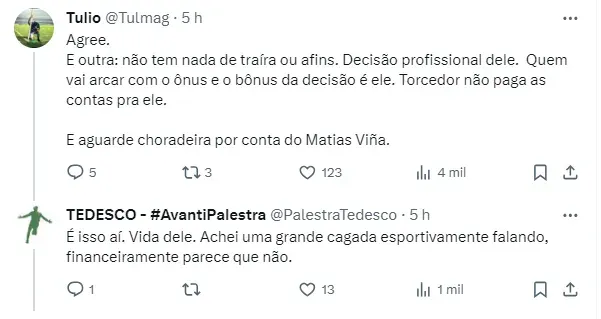 Para outros, o atleta perdeu a “admiração” dos palmeirenses, tendo em vista que no ano passado o clube fez de tudo para que o ex-camisa 14 ficasse por aqui. Principalmente após a grande temporada feita em 2022.