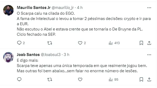 Palmeirenses e atleticanos postaram sobre o provável acerto entre Scarpa e Galo. Porém, alguns torcedores do Verdão entendem como uma situação normal do futebol e que o jogador fez o que é melhor para ele no atual momento.