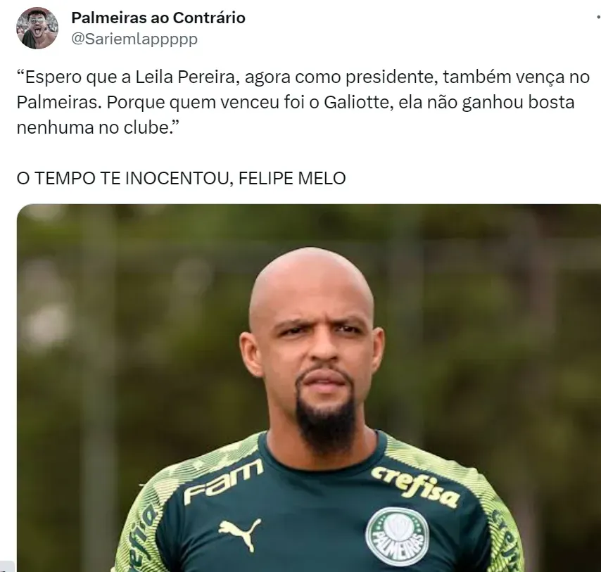 “Espero que a Leila Pereira, agora como presidente, também vença no Palmeiras. Porque quem venceu foi o Galiotte, ela não ganhou bos** nenhuma no clube”, disse Felipe Melo, ao Podcast ‘Palumbada Neles’, em dezembro de 2021. A declaração do experiente jogador foi após o Alviverde ter decidido não renovar com ele. No Twitter, os torcedores do Palmeiras estão dizendo que o tempo inocentou o veterano.