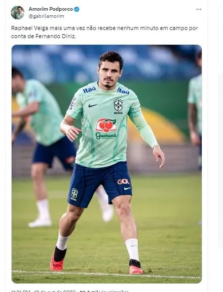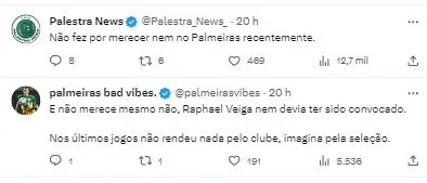 Um destes casos foi a torcida do Palmeiras, muitos torcedores comentaram sobre a ausência de Raphael Veiga e questionaram Fernando Diniz nas redes sociais por não ter colocado o atleta para jogar. Em todos os jogos da era Diniz, Veiga esteve presente em todas as convocações, porém, pouco atuou com a amarelinha. Diante disto, a torcida palmeirense repercutiu nas redes sociais.
