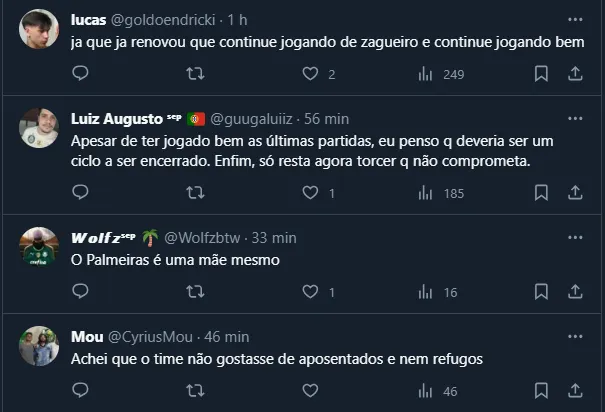 Entretanto, por mais que tenha muitos serviços prestados ao Clube, também é válido frisar que muitos torcedores não queriam a renovação, até pedirem uma repaginada no elenco. Veja abaixo algumas reações contrárias ao acordo.
