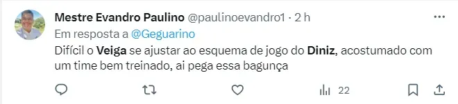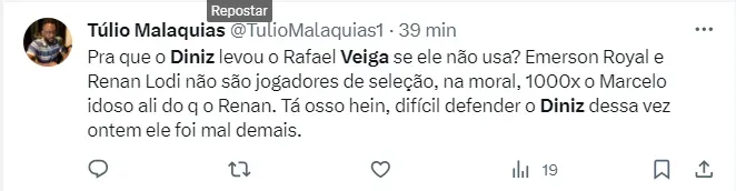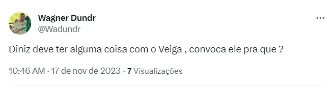 Nas redes, os torcedores não pouparam críticas pela não utilização de Veiga. Muitos palmeirenses e até torcedores de outros clubes não aprovaram a ausência do meio-campo no jogo, e teceram comentários fortes contra Diniz. Confira abaixo.