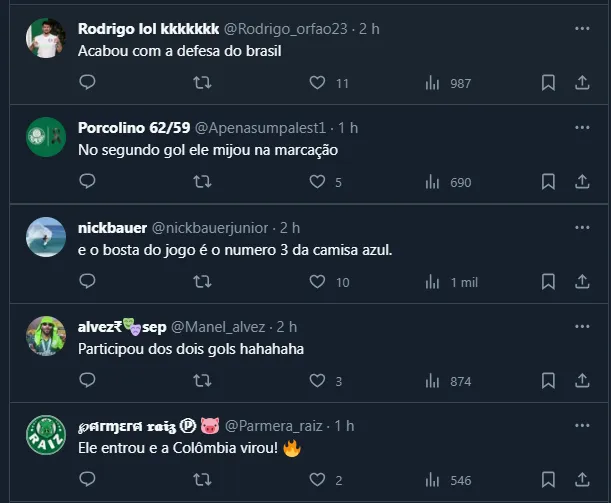 Além de ter participado da jogada dos dois gols da Seleção da Colômbia, Ríos fez um verdadeiro salseiro na defesa brasileira. No gol da virada, “escondendo” a bola com ampla qualidade.