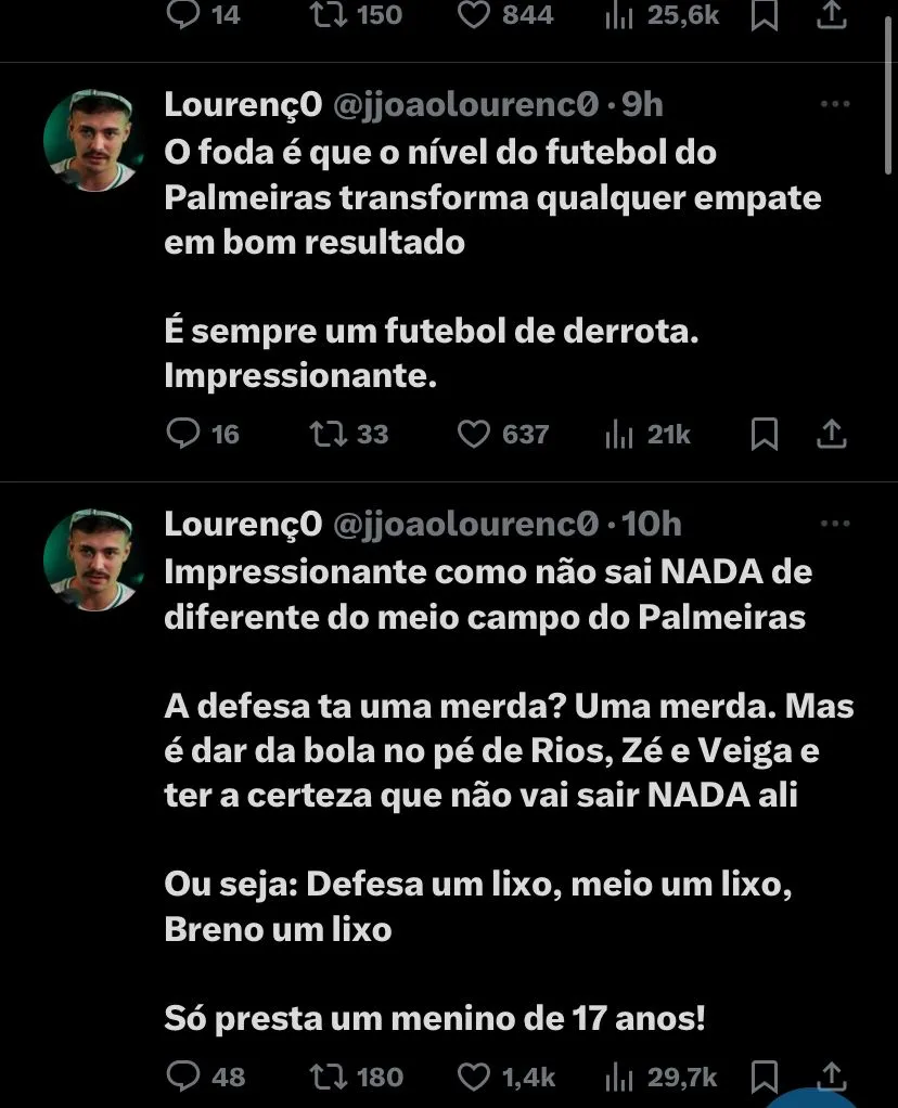 (SIC) “O Palmeiras é mal treinado. Repitam comigo: o Palmeiras é mal treinado. Agora pensem: quem é que treina o time? E tem outro lado também: o Palmeiras não tem vontade”; Realmente tem hora que me canso do Abel, os moleques foram os melhores em campo. O trio de zaga que é experiente falhando em dois gols, o mais experiente sendo expulso de maneira imbecil. Na derrota é culpa da base, na vitória é de todos”, foram os comentários.