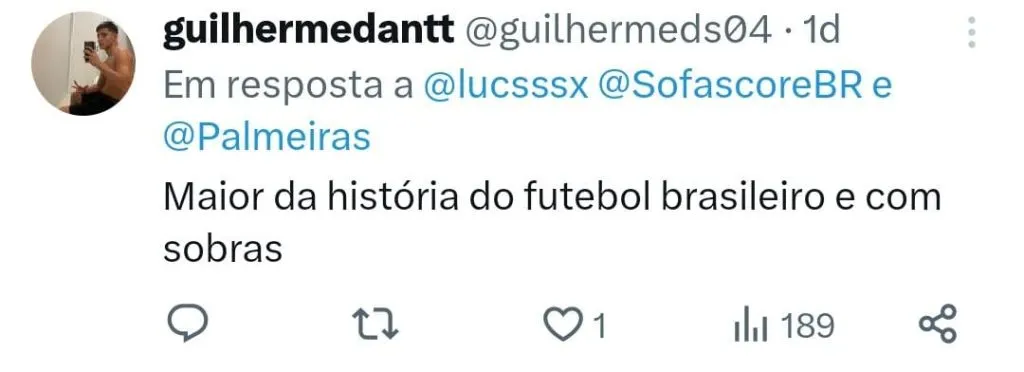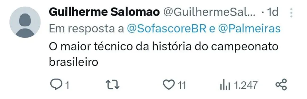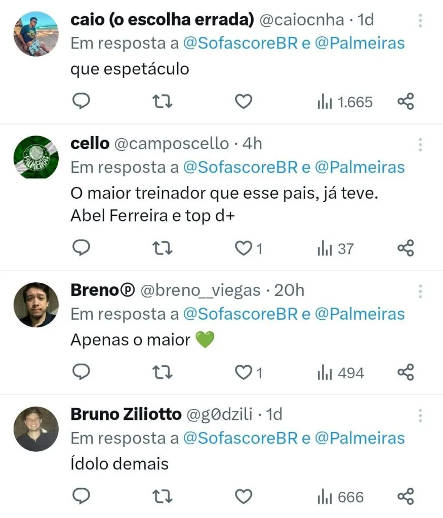 Mesmo o Palmeiras não vivendo o seu melhor momento, Abel Ferreira parece ter o apoio de grande parte da torcida alviverde. “11 finais em 3 anos,8 títulos, isso é um absurdo! Desculpa, mas o Felipão chega NEMMM perto disso. A gente só vai ter dimensão do quão grande o Abel é quando ele sair fora”, escreveu um torcedor.